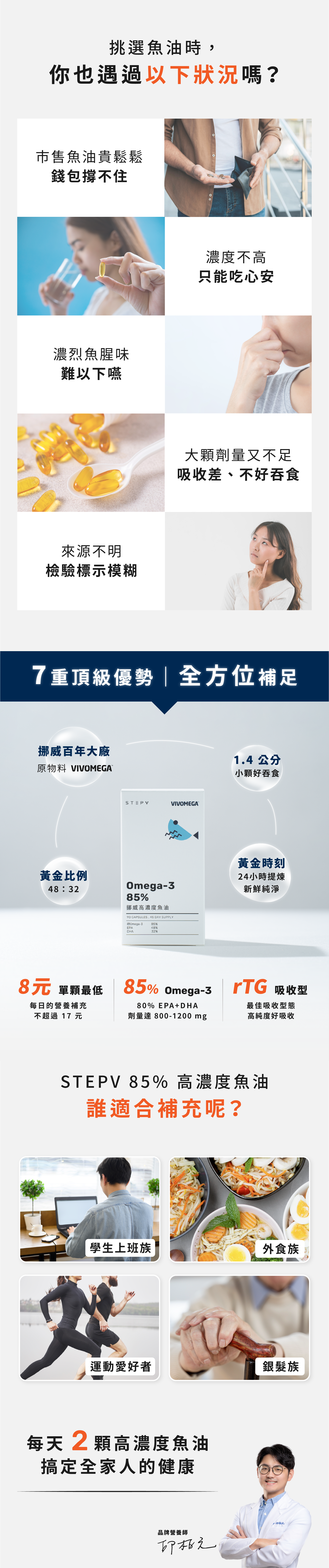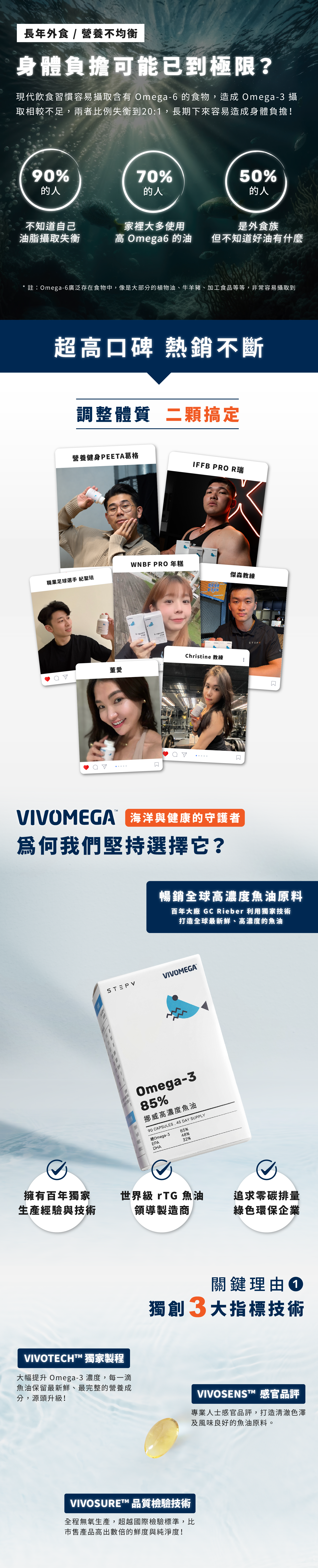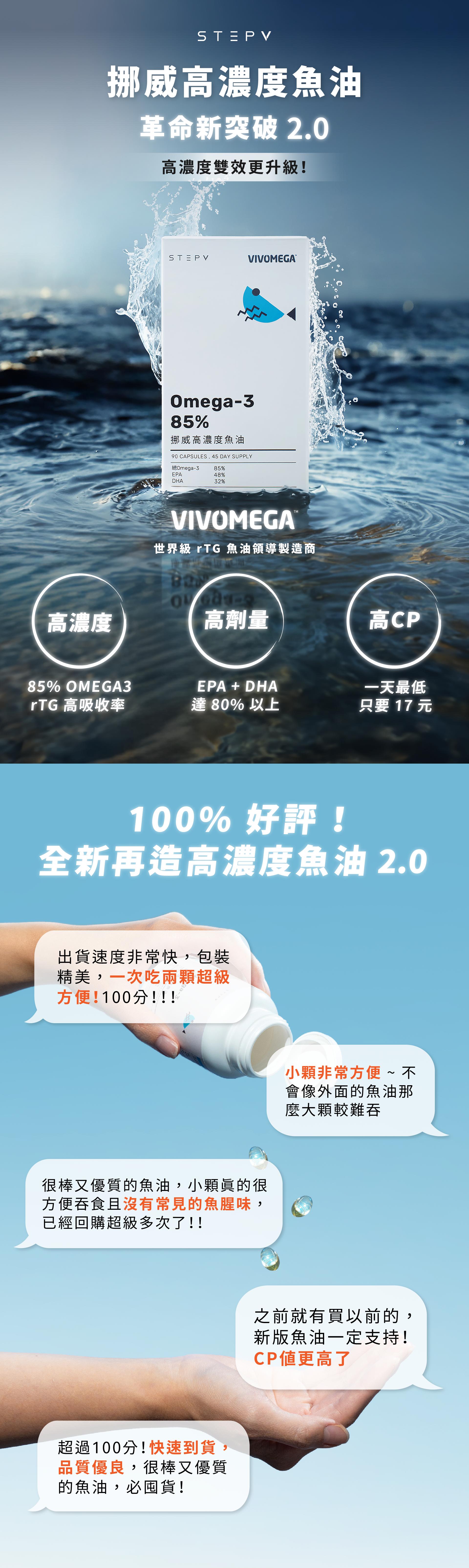 採用最新鮮的挪威百年大廠專利原料 VIVOMEGA,擁有高濃度、最佳吸收比 48:32 與 rTG 型式,小顆好吞食,威力超強!